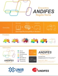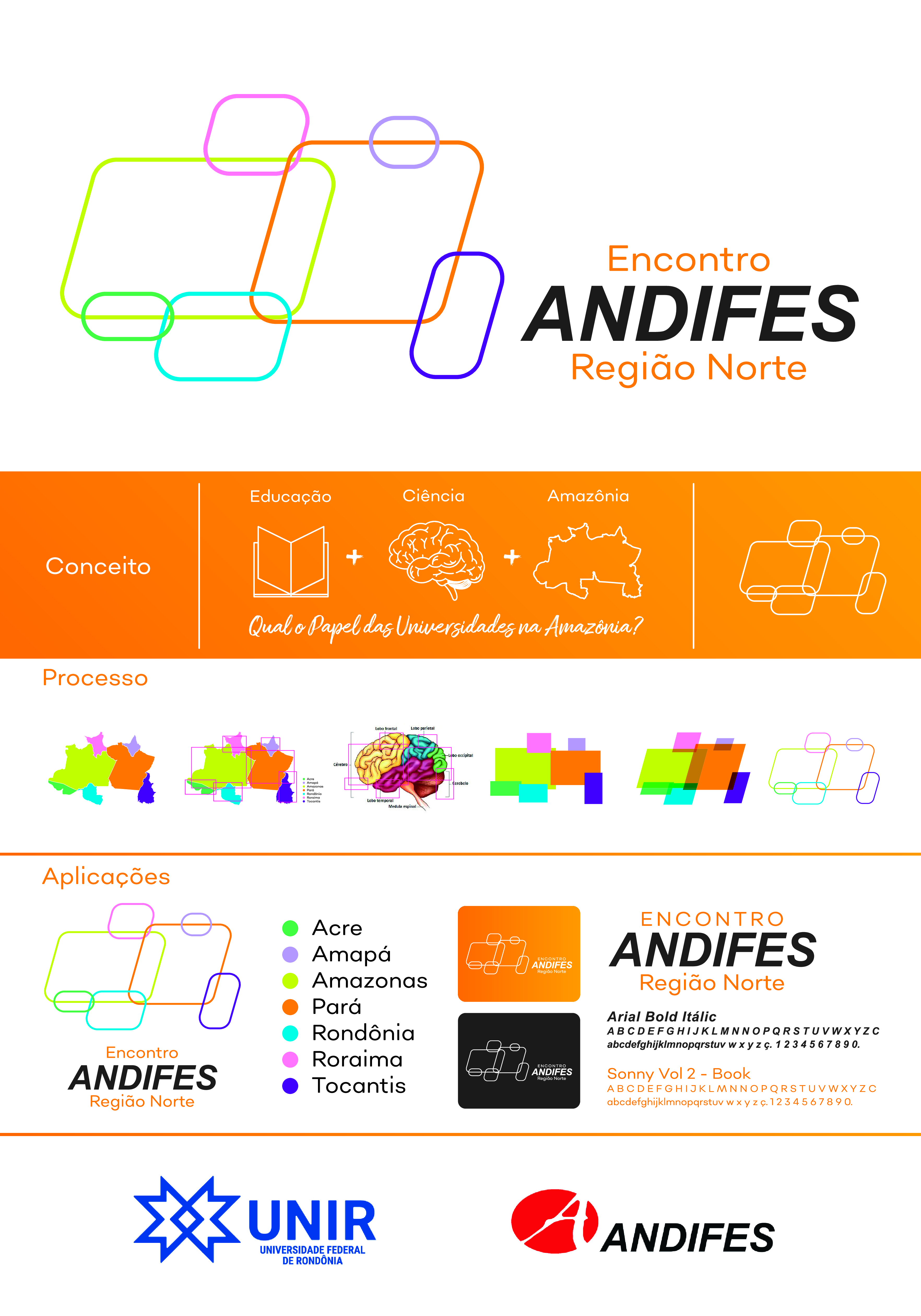 Identidade Visual do Encontro Andifes Norte A identidade visual do Encontro Andifes Norte, realizado nos dias 17 e 18 de julho de 2025 na Universidade Federal de Rondônia, UNIR, nasceu da pergunta norteadora: “Qual é o papel das universidades na Amazônia?”. A partir dessa reflexão, o design incorporou três elementos simbólicos: o livro, que representa o saber e a pesquisa; o cérebro, símbolo da ciência e da criatividade; e o mapa da Amazônia, evocando territorialidade e diversidade cultural. As linhas que conectam os estados amazônicos expressam integração e cooperação entre as universidades, enquanto a paleta cromática celebra a pluralidade dos povos da floresta, com cores que traduzem vida, respeito e diversidade. O projeto foi desenvolvido pelo Programador Visual Walter Badaró, sob supervisão do Prof. Dr. Sandro Colferai, Assessor de Comunicação da Universidade Federal de Rondônia (Ascom-UNIR). Durante o evento, que contou com a presença de reitores das universidades federais da Região Norte, a identidade visual do evento foi ponto de discussões e, por fim, foi aprovada por unanimidade como identidade visual oficial da Andifes Norte. A decisão coletiva simboliza o reconhecimento da força institucional da marca e o compromisso conjunto das universidades em comunicar, por meio de uma identidade única, o protagonismo amazônico e a cooperação entre as instituições públicas da região. O Encontro Andifes Norte é um espaço que tem se consolidado para o diálogo entre IFES da Região Norte sobre o papel das universidades federais na Amazônia. Reitores, pesquisadores e comunidades locais debateram desafios sociais, ambientais e científicos, reafirmando o compromisso das instituições com a ciência pública, a educação e o desenvolvimento sustentável. Mais que um signo gráfico, esta identidade expressa pertencimento e diálogo, traduzindo a força da construção coletiva entre universidades, pesquisadores e comunidades na busca de soluções para os desafios amazônicos.