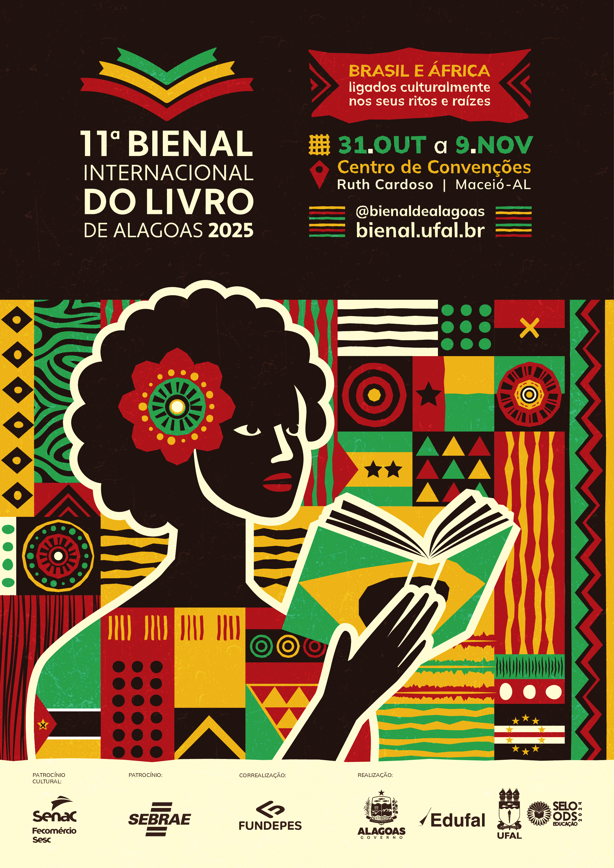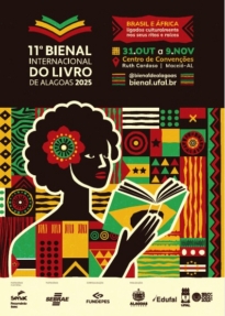 Criado para a 11ª edição da Bienal Internacional do Livro de Alagoas, o cartaz oficial do evento tem como conceito a temática “Brasil e África: ligados nos seus ritos e raízes”. A proposta gráfica parte de uma imersão simbólica nas conexões entre os dois continentes, propondo um mergulho visual que reforça o caráter plural, histórico e ancestral da cultura afro-brasileira. Com uma composição contemporânea, a linha visual do evento integra elementos gráficos inspirados em padrões africanos com uma paleta cromática vibrante e ilustrações que exaltam o conhecimento, os territórios e as pessoas. A Bienal Internacional do Livro de Alagoas é a única do Brasil realizada por uma universidade pública, o que torna este projeto ainda mais significativo, não apenas do ponto de vista criativo, mas como um símbolo de resistência, democratização do acesso à cultura e à valorização do conhecimento produzido no interior da universidade pública brasileira. O projeto é versátil e foi desenvolvido para dialogar com diferentes plataformas (impressas e digitais), garantindo coerência estética em todo o sistema de peças gráficas. O cartaz sintetiza, assim, um grande propósito da Bienal: ser espaço de encontro, escuta e transformação social. A identidade visual da Bienal foi elaborada pela nossa servidora da Ascom Camila Fialho