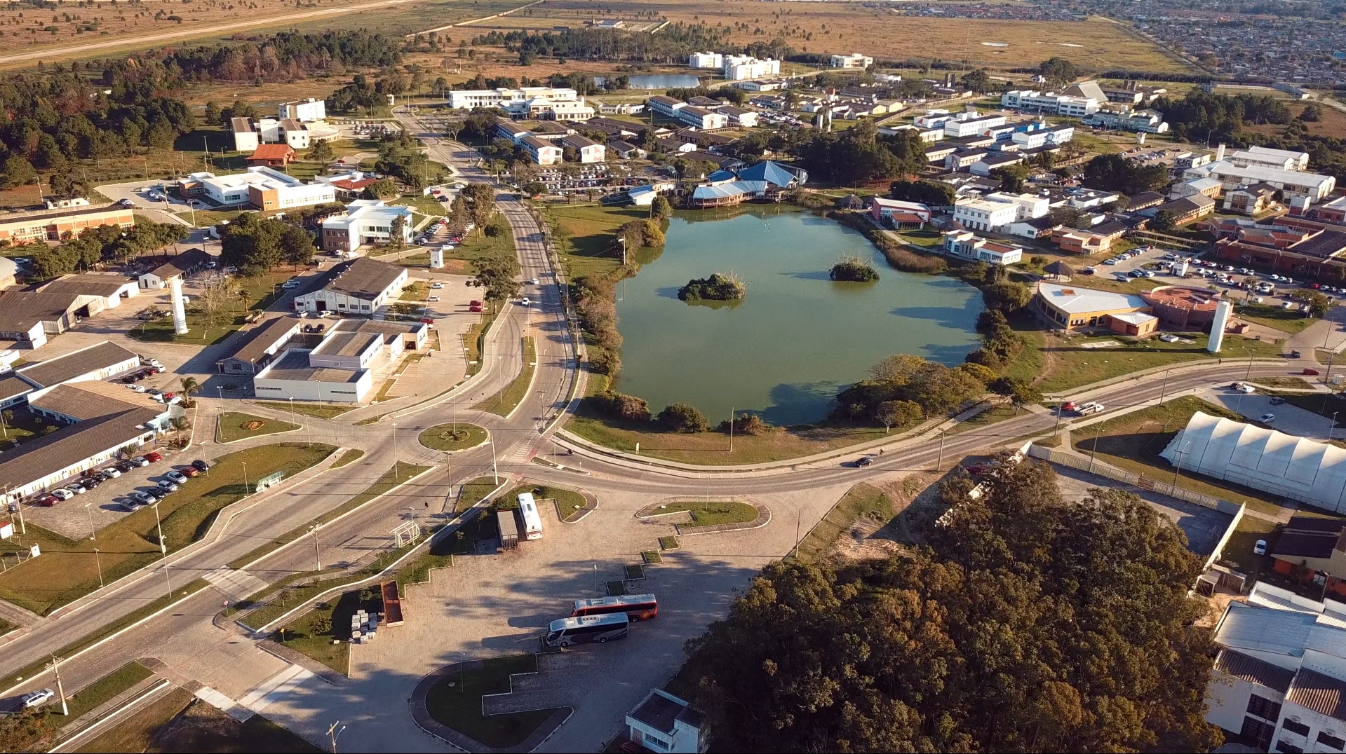 Fotografia capturada durante o sobrevoo de um drone, cuja vasta amplitude angular da lente que equipa sua câmera conferiu ao plano da imagem uma abertura latitudinal capaz de trazer ao quadro um belo recorte da paisagem que compõe o Campus Carreiros da Universidade Federal do Rio Grande, localizado na cidade do Rio Grande, RS.