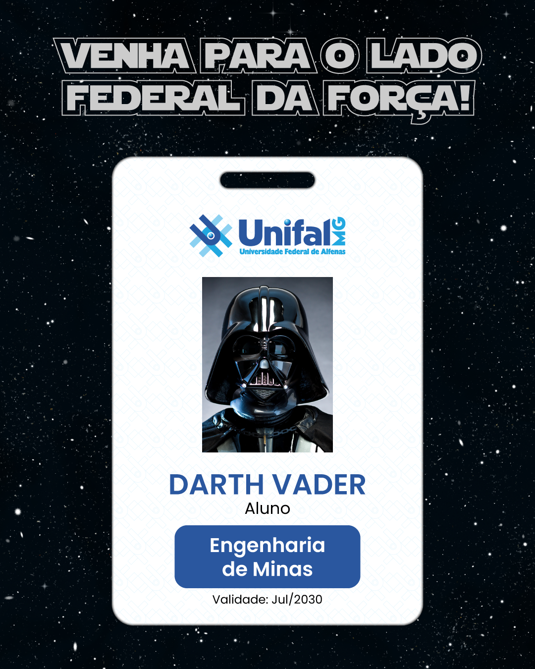 Card integrante de publicação especial em homenagem ao Star Wars Day (04/05/2024). A peça traz a frase “Venha para o lado federal da força!”, em referência ao universo de Star Wars, sobre um fundo estrelado que remete ao espaço sideral. No centro, há a representação de um crachá institucional da UNIFAL-MG, semelhante ao utilizado pelos estudantes, no qual o personagem Darth Vader aparece como aluno do curso de Engenharia de Minas. O crachá exibe ainda o logotipo da Universidade Federal de Alfenas, o nome “DARTH VADER”, a identificação como “Aluno” e a validade fictícia até julho de 2030, reforçando o tom criativo e bem-humorado da peça. Autora: Ingridy Bueno Correa