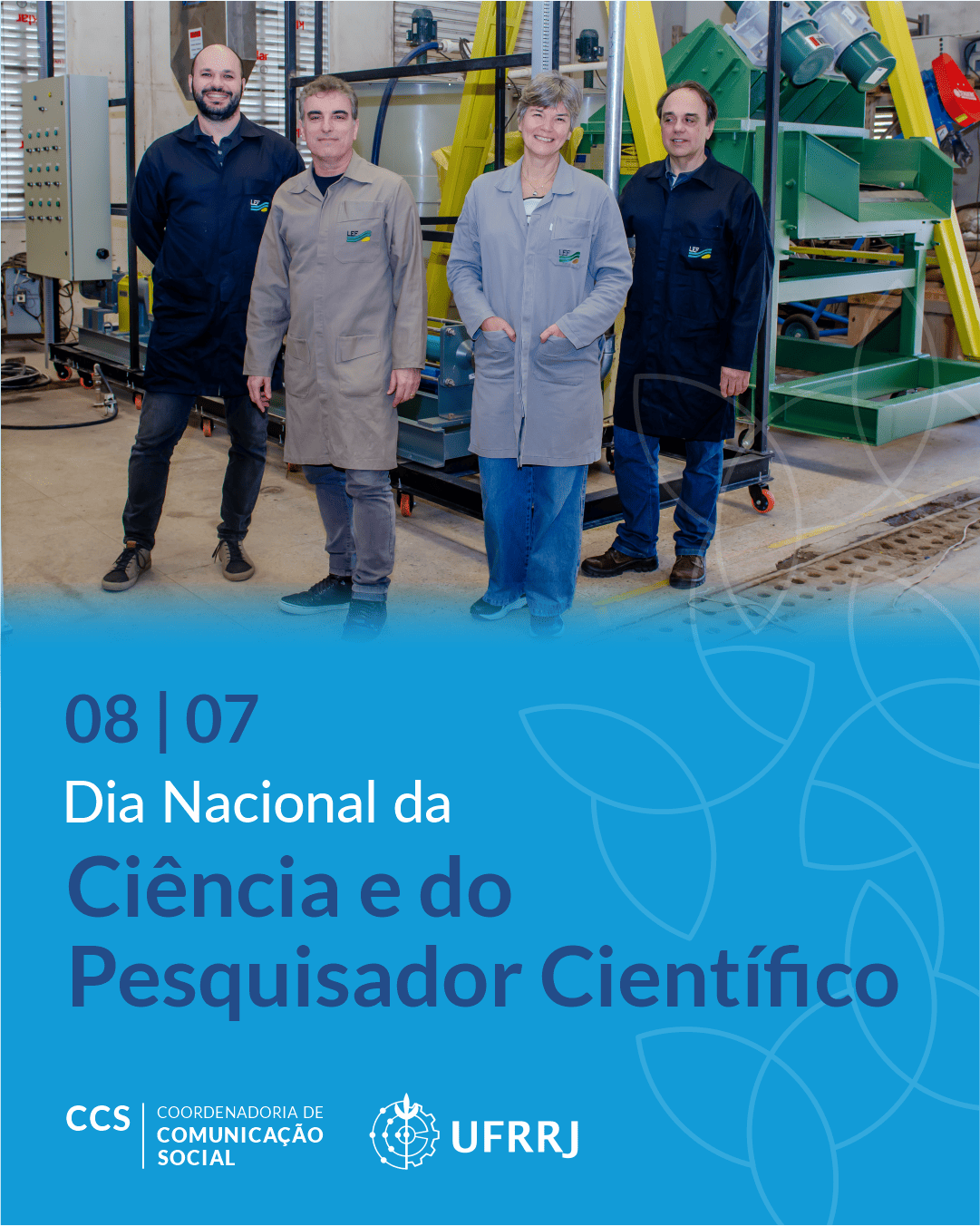 "Para o Dia Nacional da Ciência e do Pesquisador Científico, apresentamos o Laboratório de Escoamento de Fluídos (LEF) Giulio Massarani da UFRRJ. Nele atuam 50 pesquisadores. Há 20 anos, o LEF presta serviços para a Petrobrás, produzindo pesquisa aplicada e softwares que tem resultados em uma economia de milhares de dólares para a empresa pública. Na foto, alguns dos coordenadores: Cláudia Scheid, Luís Calçada, Luiz Augusto Meleiro, Filipe Furtado. Fotografias Miriam Braz CCS/UFRRJ. Foto publicada no card do Dia Nacional da Ciência e do Pesquisador Científico em 08/07/2025 e no portal da UFRRJ. https://www.instagram.com/p/DL2vsW5O2xh/ e https://portal.ufrrj.br/dia-nacional-da-ciencia-e-do-pesquisador-cientifico-conheca-o-lef-laboratorio-de-escoamento-de-fluidos-da-ufrrj/"