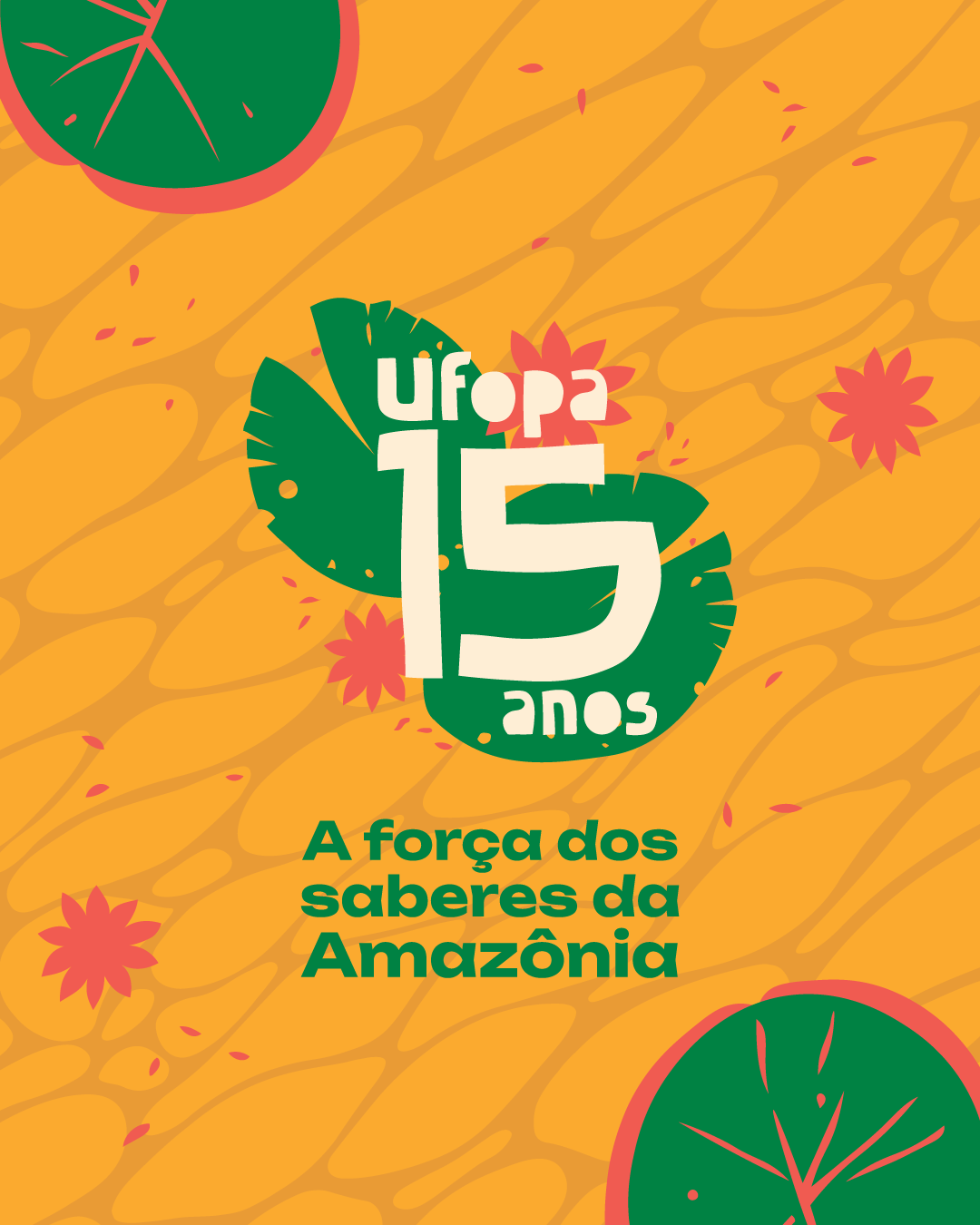 Cartaz de divulgação das comemorações de 15 anos da Universidade Federal do Oeste do Pará. O projeto gráfico, composto de elementos botânicos (folhas e flores de vitória-régia) e da água dos rios amazônicos em cores vibrantes, busca representar a integração da Ufopa com a Amazônia, seus saberes e tradições.