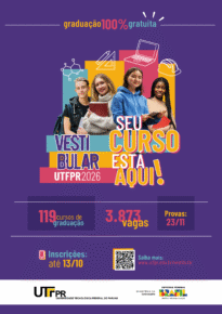Identidade visual da campanha do Vestibular UTFPR 2026. A criação gráfica contempla a diversidade de personagens, a valorização da graduação gratuita e a conexão entre o curso desejado pelo futuro estudante e as ofertas da UTFPR. A paleta de cores foi desenvolvida para transmitir modernidade e dialogar com o público jovem.